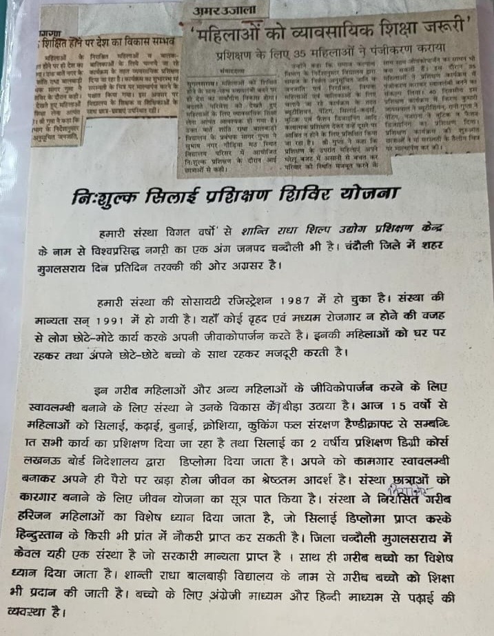 Shanti Radha Shilp Udyog Prakshikshan Kendra, based in Chandauli district near Varanasi of Uttar Pradesh, is a dedicated institution committed to empowering women through skill development while also advancing child literacy among underprivileged communities.